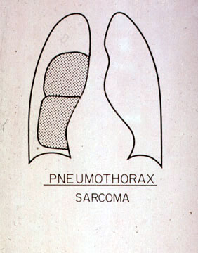 | Spontaneous pneumothorax Pneumothorax occurring secondary to pulmonary metastasis is rare. This mode of presentation occurs secondary to necrosis of subpleurally located metastases with the resultant bronchopleural fistula. Cavitating sarcoma is reported to present in this manner. In some instances, the sub pleural metastases are not sufficiently large enough to be recognized in x-rays and pneumothorax is the presenting manifestation.