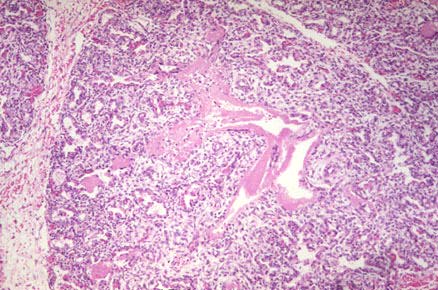 Low power photomicrographic of HMD showing immature lung with hyaline membranes.