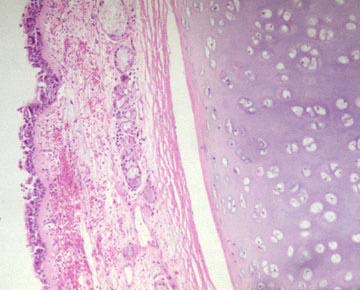 Microscopic section of normal bronchus showing respiratory epithelium, submucosal glands and cartilage.