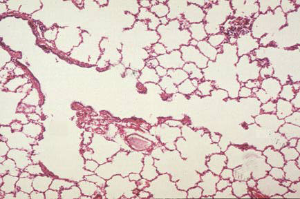 Microscopic section of normal lung showing terminal bronchiole, respiratory bronchiole, alveolar duct, alveolar sac, and alveoli.
