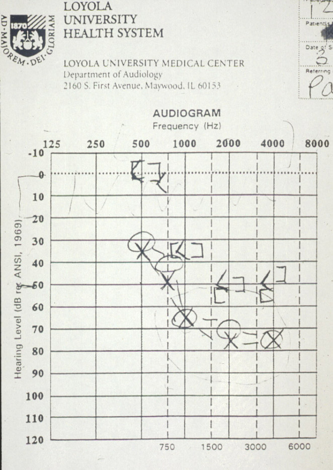 Audiogram illustrates bilateral conductive and sensorineural hearing loss. The circles are for the right ear threshold; the X's are for the left ear.