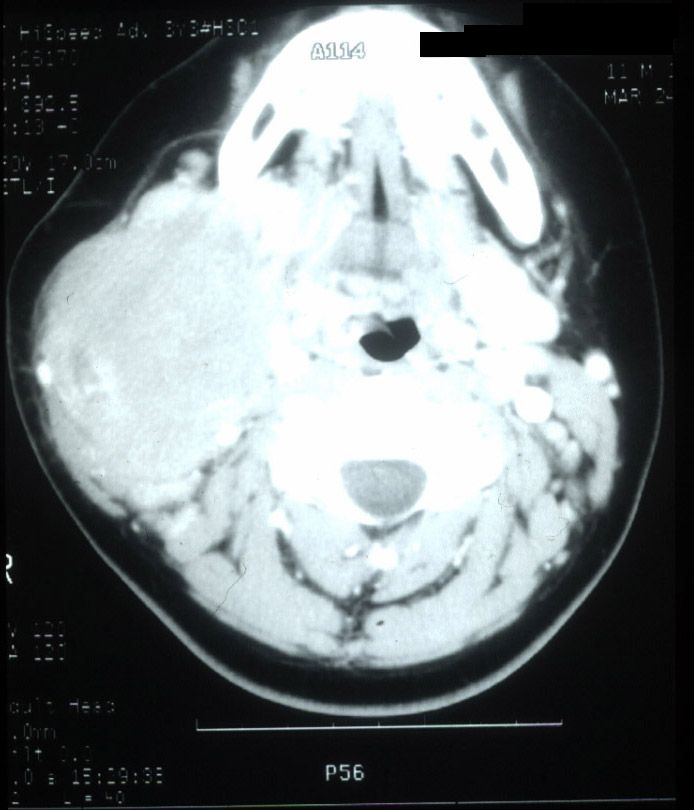 Axial CT scan illustrates a large right cervical mass. This child was diagnosed with Burkitt's lymphoma.