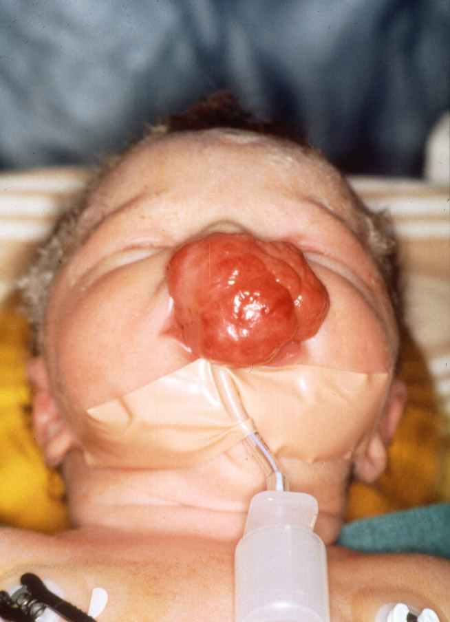 The newborn infant has a giant cell tumor of the alveolar ridge. Presentation at birth can result in significant respiratory distress.