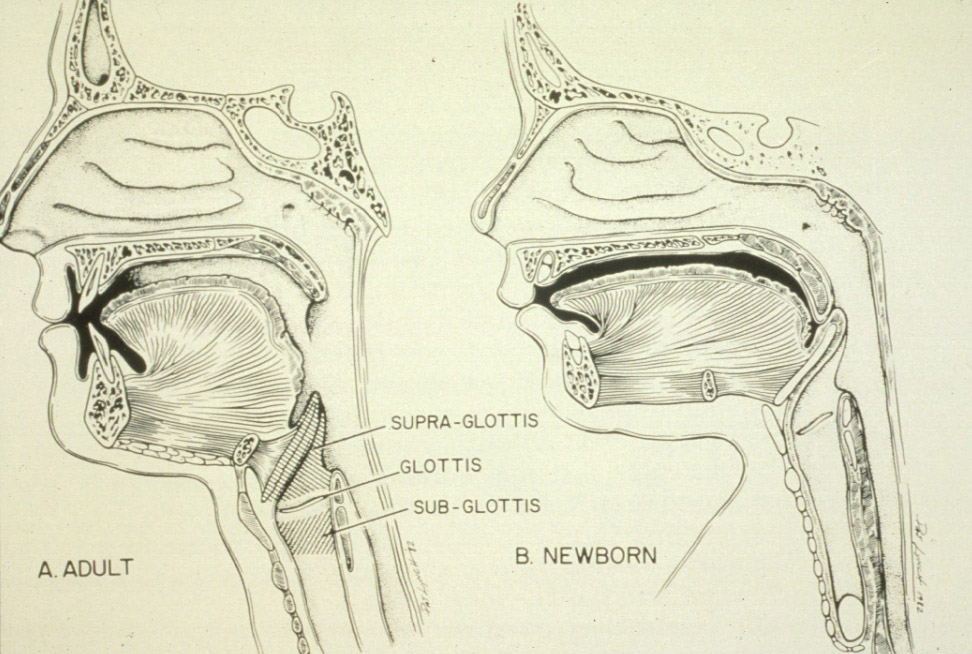 Sagittal view shows the differing anatomical structures in adults and child. The newborn has a higher relative larynx compared to that of an adult. This higher position facilitates nasal breathing.