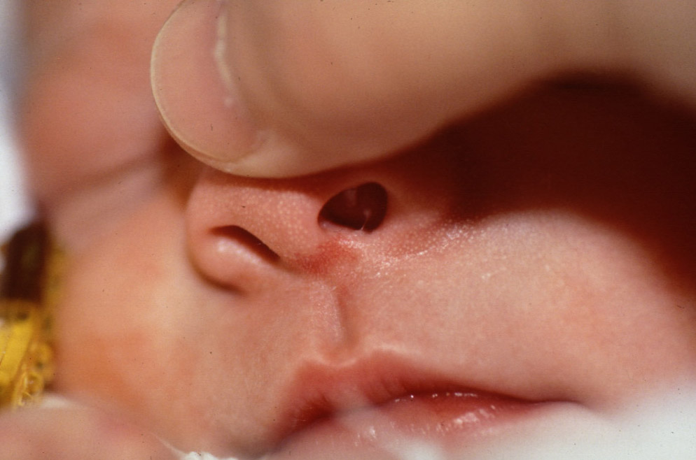 This newborn presented with respiratory distress secondary to a left intranasal glioma.