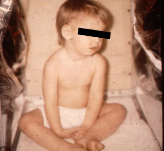 Child in an upright position, chin juttying because of imminent airway obstruction. This child has epiglottitis.