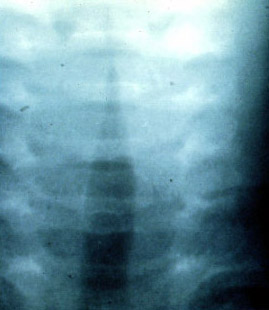 AP projection of a child with viral laryngotracheobronchitis (croup) showing the characteristic narrowing at the subglottic level (steeple sign).