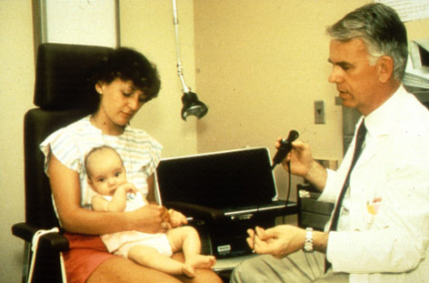 The otolaryngologist is holding a flexible laryngoscope prior to performing an endoscopic exam.