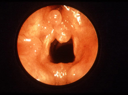 Endoscopic view illustrating laryngeal respiratory papillomatosis.