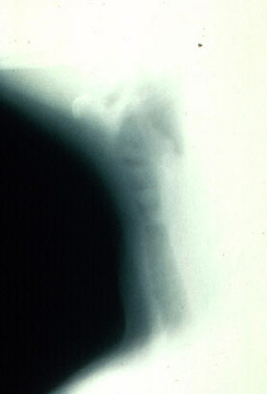 Lateral neck film showing a foreign body lodged in the subglottis.