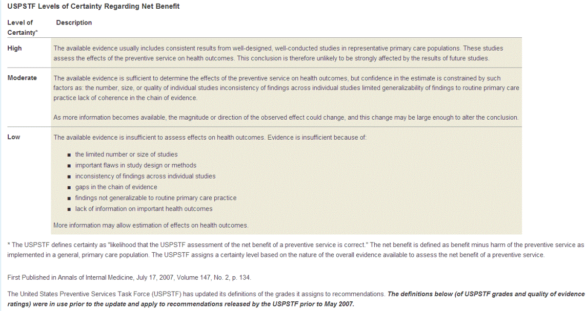 U.S. Preventive Services Task Force Ratings: Strength of Recommendations and Quality of Evidence. Guide to Clinical Preventive Services, Third Edition: Periodic Updates, 2000-2003. Agency for Healthcare Research and Quality, Rockville, MD. http://www.ahrq.gov/clinic/3rduspstf/ratings.htm