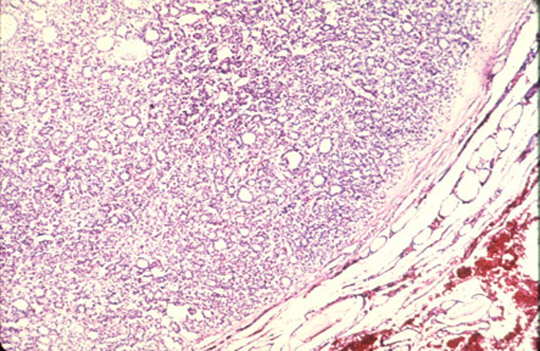 of thyroid gland reveals a follicular adenoma. The neoplasm is composed of small follicles and is surrounded in part by a thin fibrous capsule. The expanding neoplasm compresses the adjacent normal thyroid.