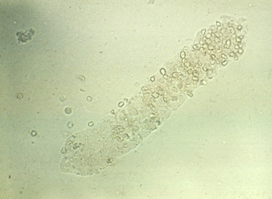Microscopic urinalysis reveals a protein cast containing red blood cells. The RBC's are anucleate. The cast takes the shape of the renal tubule.