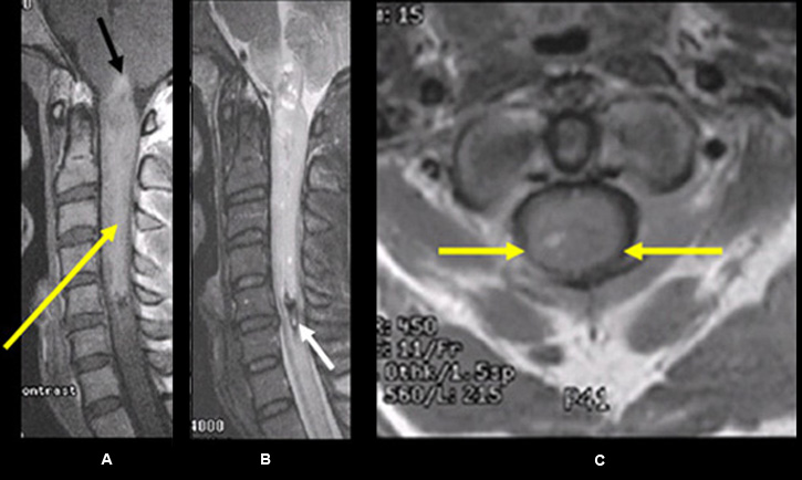 - sausage-shaped intensely enhancing tumor (yellow arrow) is seen within the upper cervical cord extending from just above the craniocervical junction with involvement of the dorsal medulla (black arrow) down to C5 level