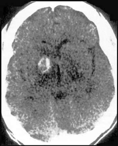 Findings: Enhancing ring lesion within the right caudate nucleus.