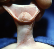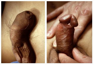 | Occasionally, the urethra develops only to the junction of the penis and scrotum. This boy has peno-scrotal hypospadias. As in this case, severe forms of hypospadias are accompanied by shortening of the urethral groove that causes ventral tethering of the penis. This condition, called chordee, can be severe enough to make sexual function impossible. |