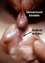 | When the internal urethral folds fail to fuse, causing hypospadias, the external urethral folds usually fail to fuse, causing a dorsal hood foreskin. Notice that the median raphé lies at an angle on the penile shaft. |