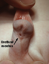 | If the fusion of the urethral folds fail to progress distally on the ventral penis, the urethra will be shortened. Hypospadias occurs when the fusion of the urethral folds stops proximal to the tip of the glans penis. The term, hypospadias, means under [hypo] the rent [spadon]. The rent refers to the appearance of the ventral glans penis. It appears to have been ripped (rent) apart. Hypospadias can occur anywhere along the urethral groove. In mild forms, the urethra opens just under the corona glandis. This is called coronal hypospadias. | ![]() |
