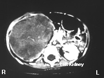 This is a contrast CAT scan; intravenous contrast was administered while the images were being obtained. Notice that the left kidney is relatively lighter that the adjacent muscle (posterior to the vertebral body) because contrast is being concentrated in the renal parenchyma. CAT scans can tell us if a kidney is perfused and if it has tubular function. If the kidney were not perfused and functioning, the renal parenchyma would be the same shade of gray as the adjacent muscle. Notice that the right kidney is enlarged. It doesn't have the uniform light gray that the left kidney has. Instead a relatively heterogeneous mass is present. Notice that there is a thin rim of white around the right kidney. This is normal renal parenchyma (concentrating the intravenous contrast) stretched over the encroaching tumor. This child has a Wilm's tumor, the most common renal tumor in children.