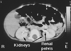 This is a contrast CAT scan; intravenous contrast was administered while the images were being obtained. Notice that the kidneys are slightly lighter grey than the adjacent muscle tissue near the vertebral body. This results from the kidney concentrating and excreting iodinated contrast. The renal parenchyma is relatively homogeneous. CAT scans are fairly sensitive indicators of kidney function. If a kidney were not functioning (from lack of perfusion, severe tubular dysfunction, etc.) then the kidneys wouldn't 'enhance' (appear lighter grey). The renal pelvis is white because iodinated contrast has filled the collecting system. |